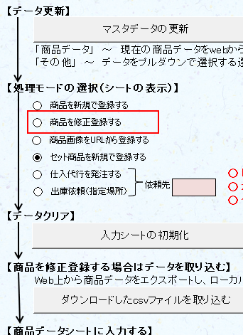 - 処理モード を 「商品を修正登録する」 を選択する