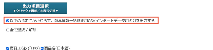 出力する列のところで「以下の指定にかかわらず、商品情報一括修正用CSVインポートデータ用の列を出力する」にチェックを入れます。