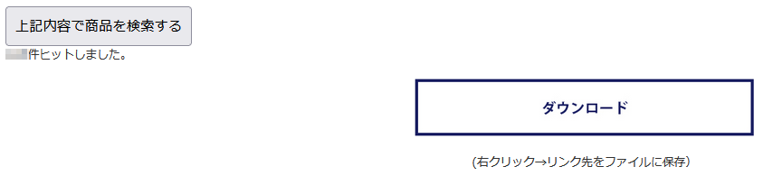 ※商品カテゴリや在庫商品の区分、任意キーワードの欄に検索条件を入力して対象を絞ることも可能です。 - 「上記内容で商品を検索する」ボタンをクリックし、表示されたダウンロードボタンをクリックして、適当なところにcsvファイルを保存します。