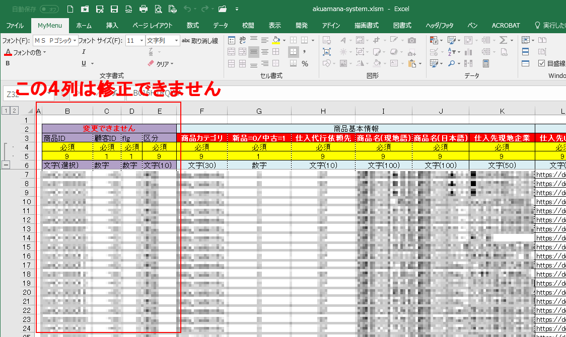 商品情報は(日頃使い慣れている)Excelを使って新規登録・修正・画像登録が可能です。ただし、商品データの破損を防ぐため、当社で指定したExcelファイルを使用していただくことになります。Excel側の事前準備(VBAプログラム使用等)詳しくはコチラをご覧ください。